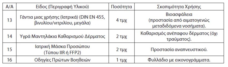 Ανάμεσά τους περιλαμβάνονται κουβέρτα διάσωσης ισοθερμική με συγκεκριμένες διαστάσεις, λευκοπλάστης, τραυμοπλαστ, επιδέσμους, επιθέμα εγκαυμάτων και πληγών, ψαλίδι πρώτων βοηθειών, γάντια μιας χρήσης, υγρά μαντιλάκια καθαρισμού δέρματος, ιατρική μάσκα προσώπου και οδηγίες πρώτων βοηθειών.